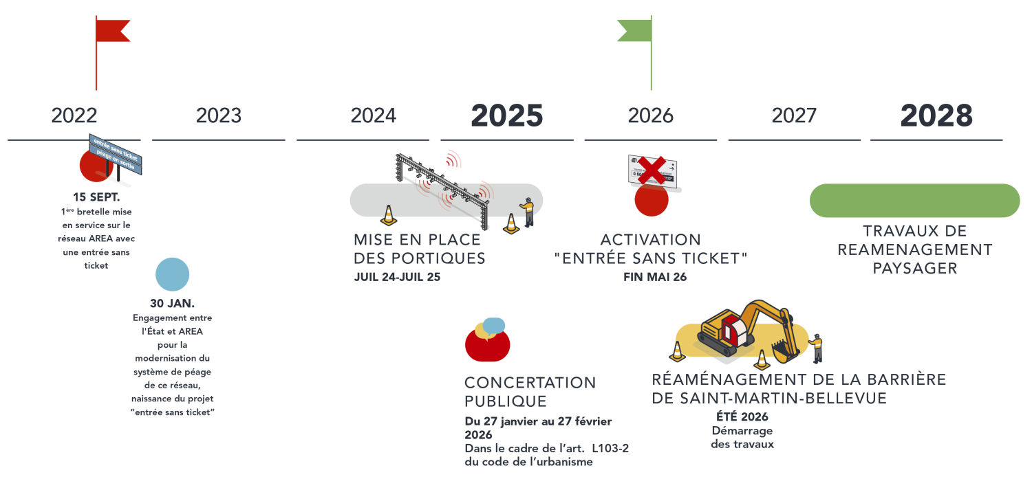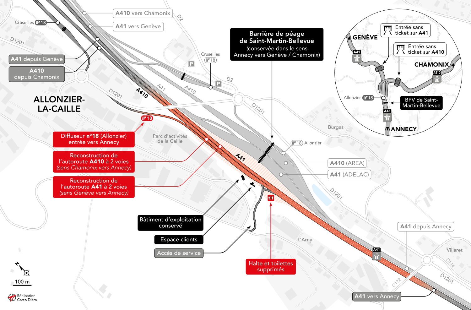 Le déploiement du système « entrée sans ticket » va entraîner le démontage de la barrière de péage de Saint-Martin Bellevue sur l’autoroute A41N dans le sens des entrées depuis Genève ou La Roche-sur-Foron vers Annecy, ce qui va libérer une importante surface de terrain.